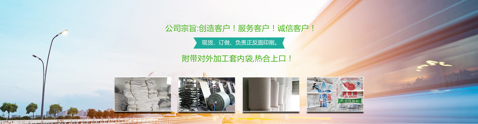本公司常年生產(chǎn): 編織袋、彩膜、食品袋、集裝袋、飼料袋、化肥袋、水泥袋、化工袋、普危包裝袋、坯布專(zhuān)用內(nèi)袋、包皮、印染廠(chǎng)整裝專(zhuān)用包裝、有現(xiàn)貨、也訂做、負(fù)責(zé)正反面印刷。附帶對(duì)外加工套內(nèi)袋,熱合上口!聯(lián)系人:王經(jīng)理。 公司宗旨:創(chuàng)造客戶(hù)!服務(wù)客戶(hù)!誠(chéng)信客戶(hù)! 13256289338.17686389888